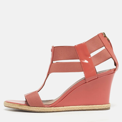 These Fendi espadrille wedges combine glossy coral patent leather with elastic fabric for a vibrant and comfortable fit. The T strap design and woven sole offer a playful yet chic warm weather look.