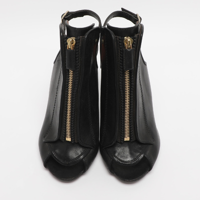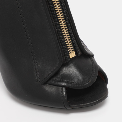 Sleek and edgy, these Givenchy booties are crafted in smooth black leather with bold zipper detailing and a secure ankle strap. The peep toe silhouette adds a flirty twist to the strong structure. Ideal for evening outfits or elevating casual denim with rock chic flair.