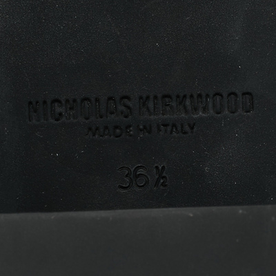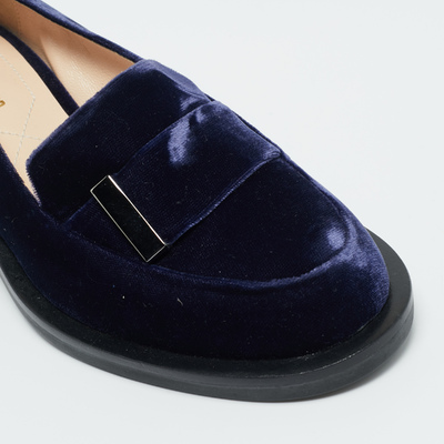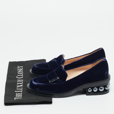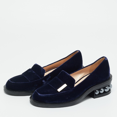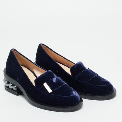 Nicholas Kirkwood’s loafers redefine luxury with signature pearl detailing inset in the heel. Crafted in plush navy blue velvet, they showcase clean lines and impeccable comfort. An embodiment of quiet opulence, ideal for both smart casual and evening dressing.