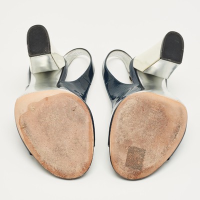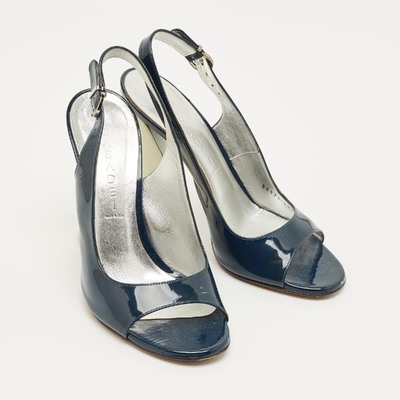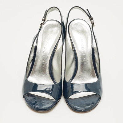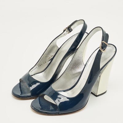 Glossy navy patent leather and a slim slingback strap define these preloved Casadei pumps. The open toe and sculpted block heel make them an easy choice for evenings or dressy days.