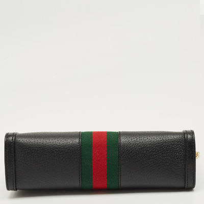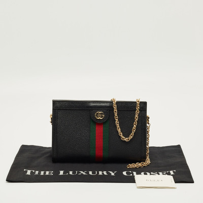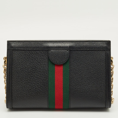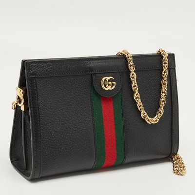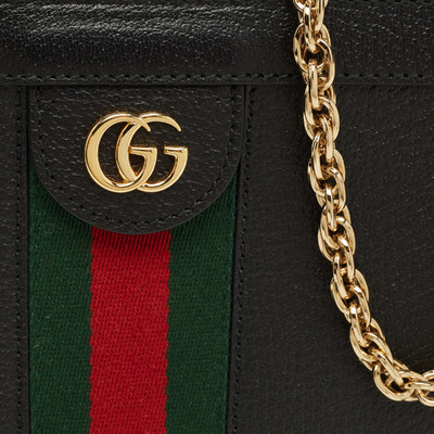 This Ophidia shoulder bag by Gucci features black leather with the iconic web stripe and interlocking GG logo. Finished with a chain strap, it brings vintage inspired elegance to modern styling.