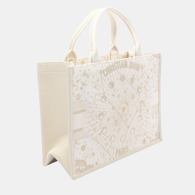 The Christian Dior Book Tote Medium Canvas and Leather Tote in White/Gold is a refined statement of modern elegance and timeless craftsmanship. Crafted from crisp white canvas accented with subtle gold detailing, the bag combines durability with couture level sophistication, perfectly embodying Dior’s signature aesthetic.
