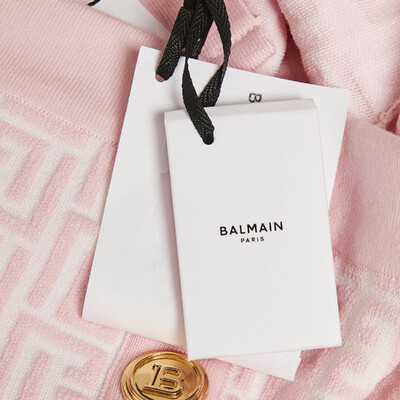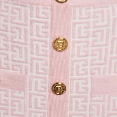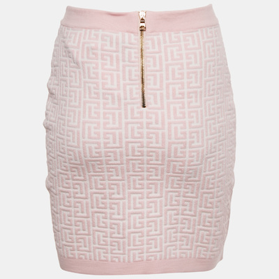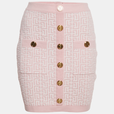 Balmain’s monogram takes center stage on this pink jacquard knit skirt. Fitted with two pockets and gold tone buttons, it hugs the waist cleanly and sits just above the knee.