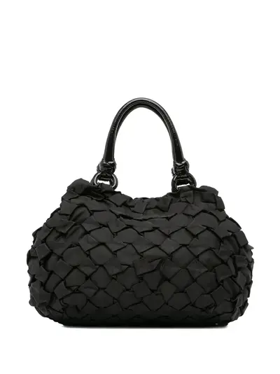 weave nylon body rolled patent leather handles magnetic snap button closure interior zip and slip pockets black This item has no inclusions. Condition: GOOD. This previously owned and used item is in good condition with minimal signs of use. This may include fading of material or plating and scratches. Please refer to the photos on this product page for a detailed view of the item, including any damages declared.