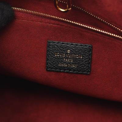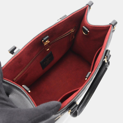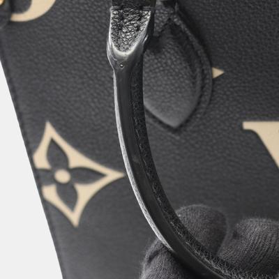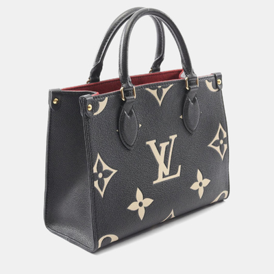The Louis Vuitton On The Go PM features soft Monogram Empreinte leather in black and beige tones. Designed with dual handles and a removable strap, it offers flexible carrying options and structured organization.