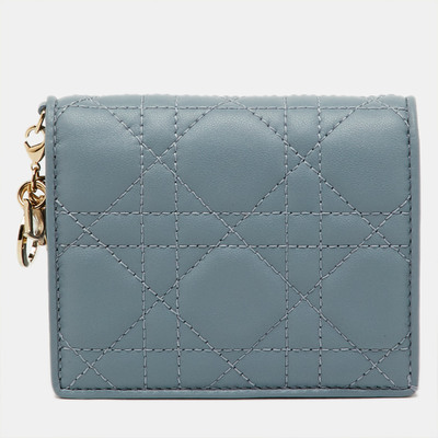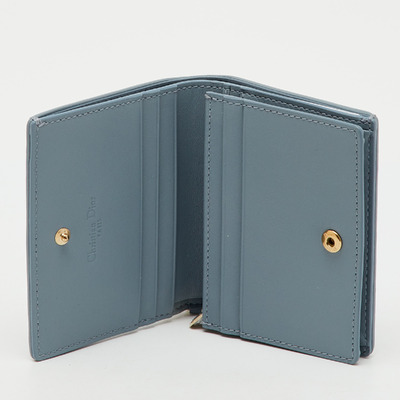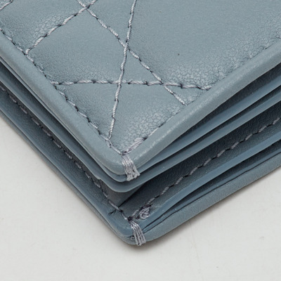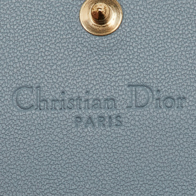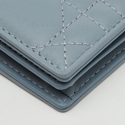 This Mini Lady Dior Gardenia wallet brings the house’s couture codes into small leather goods. Crafted in cloud blue Cannage quilted leather, it features the Dior letter charms and refined stitching. Compact yet structured, it encapsulates elegance in every fold and clasp.
