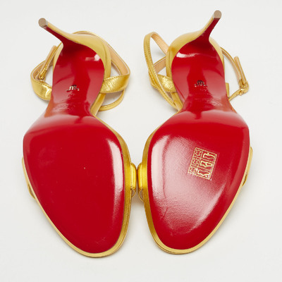 Christian Louboutin’s Loubi Queen sandals exude radiant sophistication. Crafted in gleaming gold leather, they feature slender straps and a delicate ankle buckle set atop a vertiginous stiletto heel. The iconic red lacquered sole completes the silhouette — a signature of confident allure and timeless design.