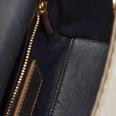 Tiny cannage detailing in shimmering metallic gold patent leather elevates this Mini Lady Dior tote into a radiant piece. The structured form feels light on the shoulder, while the reflective finish catches light with every move.