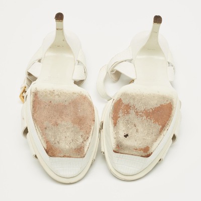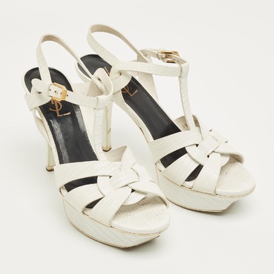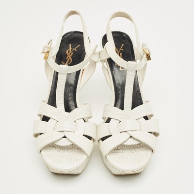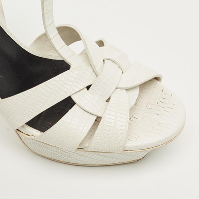 In crisp white lizard embossed leather, these YSL Tribute sandals bring together height and balance. The woven straps frame the foot neatly, resting on a sturdy platform heel that makes long wear feel effortless.