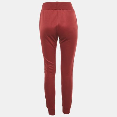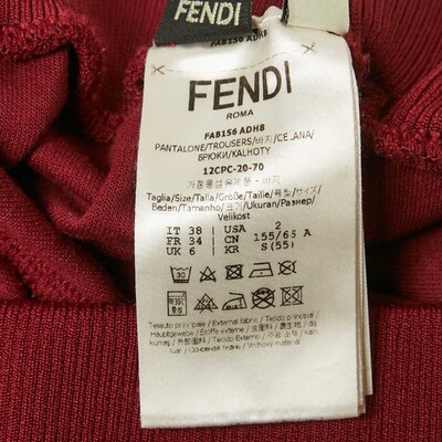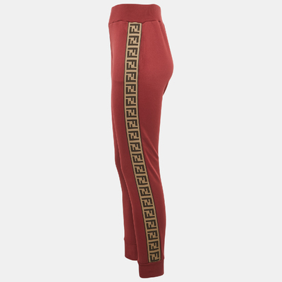 Fendi redefines casual dressing with these red jersey joggers featuring the iconic FF logo band along the sides. Cut for a relaxed fit, they combine comfort and statement design with an elastic waistband and ribbed cuffs. Perfect for off duty days that demand both ease and refined luxury.