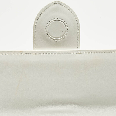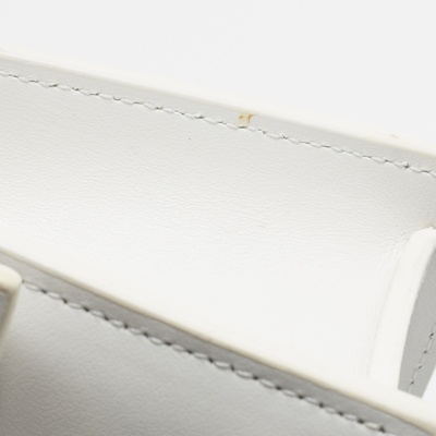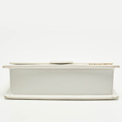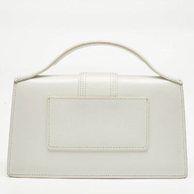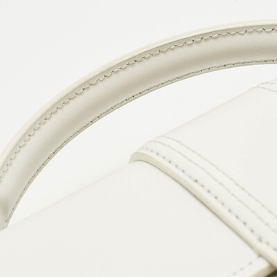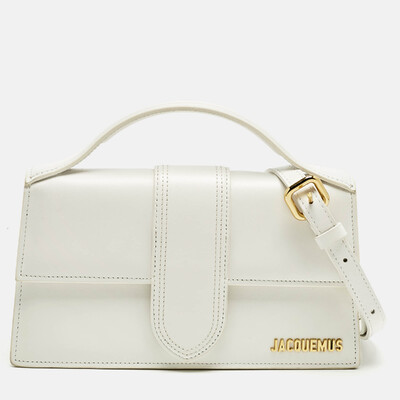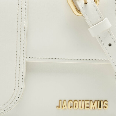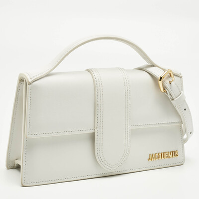Sleek and sculptural, Jacquemus’ Le Grand Bambino bag in white leather elevates minimalist sophistication. Its shoulder strap, gold tone accents, and top handle exude effortless Parisian charm while the brand motif on the front gives a signature update.