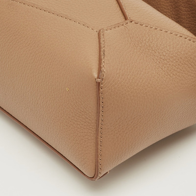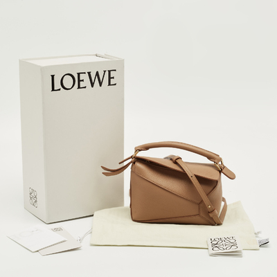 Loewe’s Mini Puzzle bag exemplifies the brand’s architectural craftsmanship. Constructed from supple brown leather with precise geometric panels, it transforms seamlessly between shapes — from a top handle to a crossbody. Finished with hand painted edges and an adjustable strap, it reflects the house’s innovative design language and meticulous attention to detail.