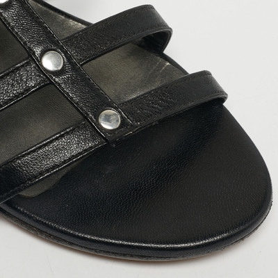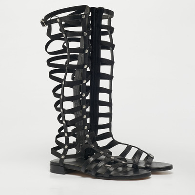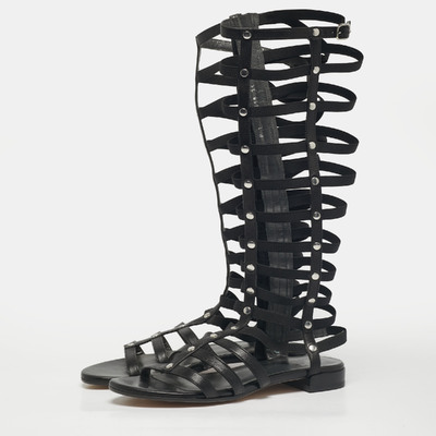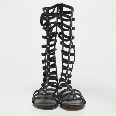 These gladiator sandals from Stuart Weitzman are crafted from black leather with elastic straps that wrap neatly along the leg. Designed with metal stud accents and a back zipper, they offer an easy fit and a stylish look.