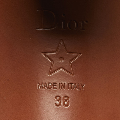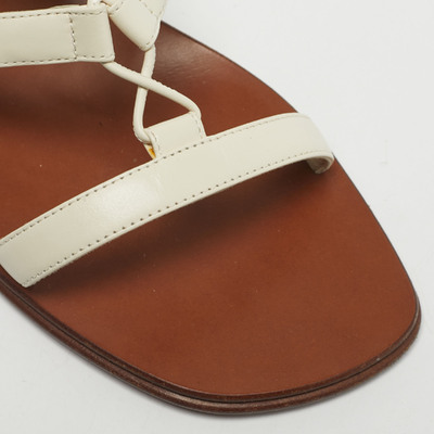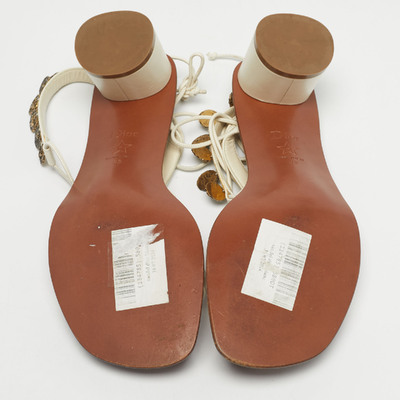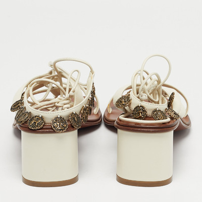 These Dior gladiator sandals tell a story of sunlit walks, linen dresses, and the kind of ease that only well made shoes can bring. Crafted from smooth cream leather, they wrap gently around the foot with slender straps and soft laces that tie at the ankle. Gilded medallions at the heel recall Dior’s rich design heritage, adding a hint of luxury to the clean silhouette. With a comfortable block heel, they move easily from brunch to a night out.