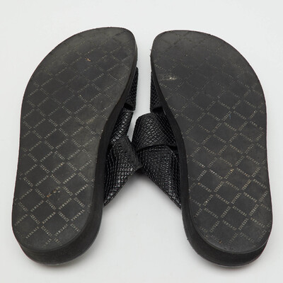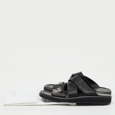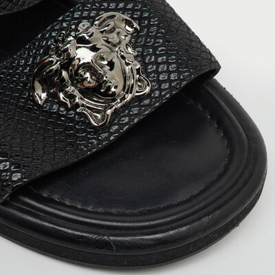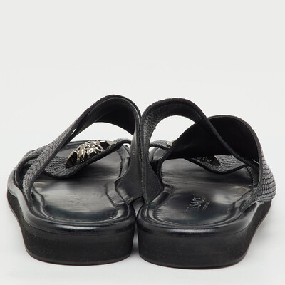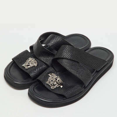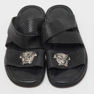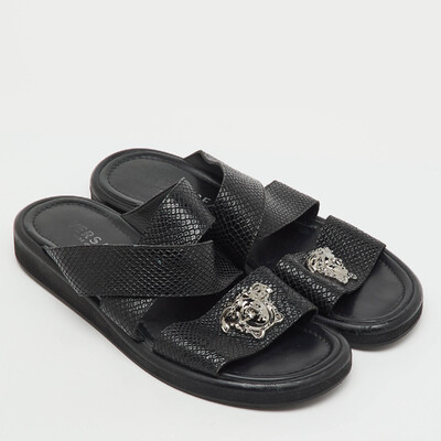 These preloved Versace slide sandals are crafted from textured black leather with wide crisscross straps for a secure fit. The signature Medusa emblems in silver tone hint at heritage. Set on a cushioned sole, they combine comfort and statement style for laid back days.