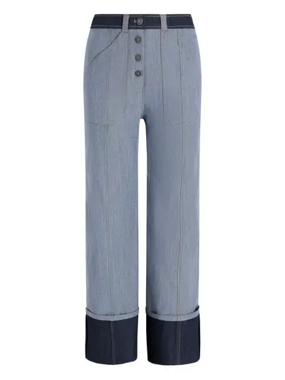 light and indigo blue cuffed hems button fly slash pockets contrast waistband