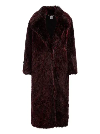 burgundy long length wide lapels side pockets long sleeves faux fur texture