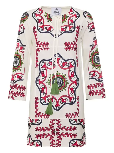white and red embroidered design tassel detail round neck long sleeves lace-up fastening
