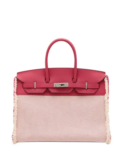 canvas body with Swift leather trim in Framboise and Ecru color rolled leather handles front flap with turn-lock closure silver hardware interior open and zip pockets pink Inclusions: dust bag, box. Condition: EXCELLENT. This previously owned item is in near-perfect condition with no signs of damage or use. Due to the exclusivity of this item and its limited availability, processing and delivery might take longer than usual. Please refer to the photos on this product page for a detailed view of the item, including any damages declared.