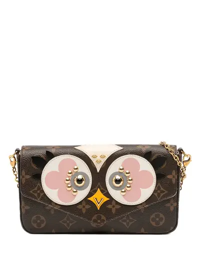 monogram canvas body detachable chain shoulder strap flap with snap button closure leather insert with card slots zip pouch interior slip pocket brown Serial Number: TJ0147 Inclusions: pouch. Condition: GOOD. This previously owned and used item is in good condition with minimal signs of use. This may include fading of material or plating and scratches. Please refer to the photos on this product page for a detailed view of the item, including any damages declared.