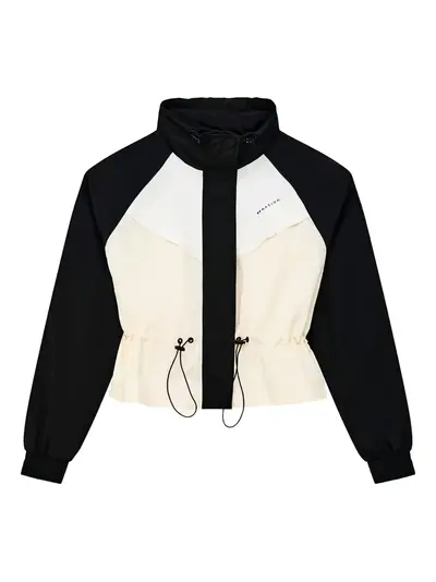 light beige and black panel design drawstring details high neck long sleeves chest logo print