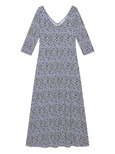 blue graphic print three-quarter sleeves V-neck A-line skirt midi length
