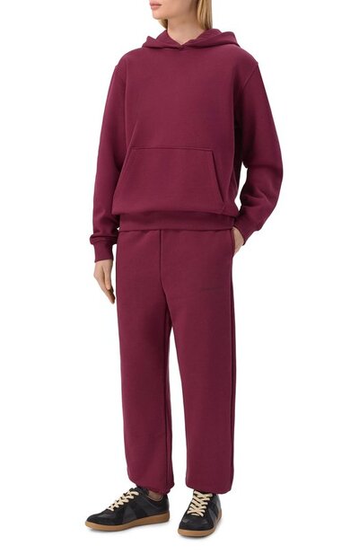 Джоггеры с эластичными манжетами и поясом сшили из хлопкового трикотажа с добавлением полиэстера. Модель дополнили тремя карманами, расположив под левым боковым принтованный логотип.
