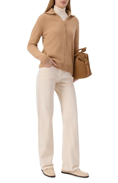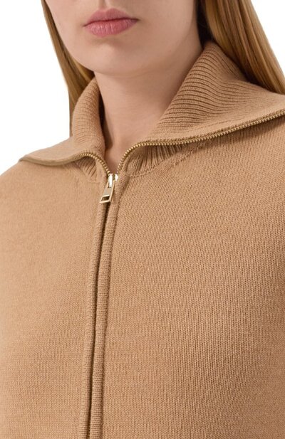 Кардиган с манжетами, поясом и широким отложным воротником в рубчик связали гладким узором плотностью семь петель на дюйм из шерсти первого пострига с добавлением кашемира и шелка. Модель на молнии дополнена боковыми карманами.