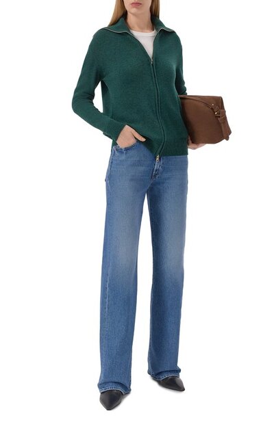 Кардиган с манжетами, поясом и широким отложным воротником в рубчик связали гладким узором плотностью семь петель на дюйм из шерсти первого пострига с добавлением кашемира и шелка. Модель на молнии дополнена боковыми карманами.