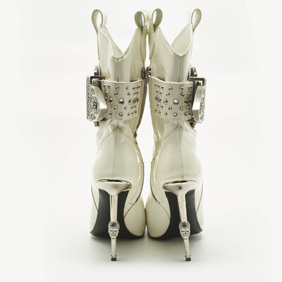 These pre loved Philipp Plein cow boots in white patent leather sparkle with a crystal embellished buckle belt and a skull detailed heel, turning a familiar silhouette into something unexpected. They pair as easily with jeans as they do with statement skirts.
