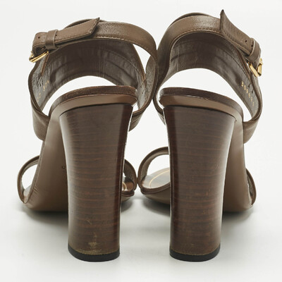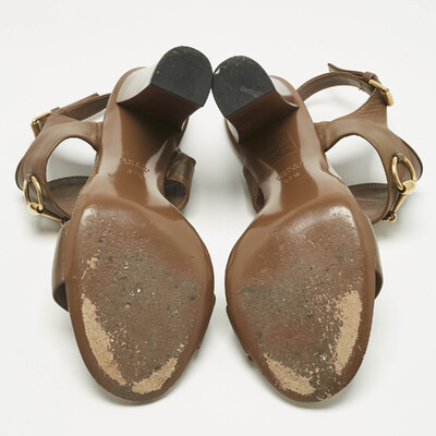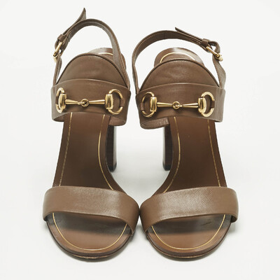 Gucci’s brown leather sandals bring elegance to every step. Smooth leather straps cradle the foot, while the signature horsebit detail gives it a signature flair. The ankle strap secures with ease, and the block heel gives just enough lift to move with grace.