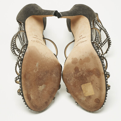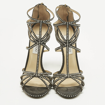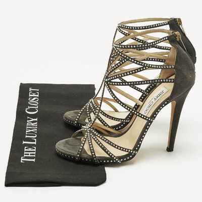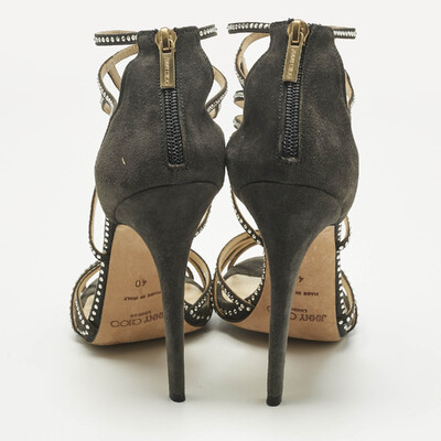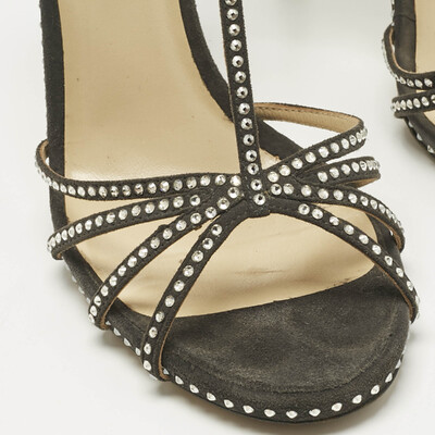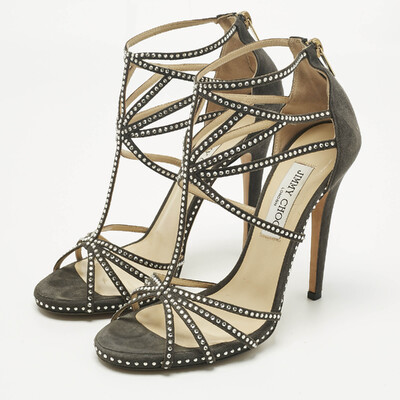 These authentic Jimmy Choo Thistle sandals feature green suede straps that hug the foot, with crystals sparkling along the straps and edges. A stiletto heel adds lift, while the back zipper makes them easy to slip on.