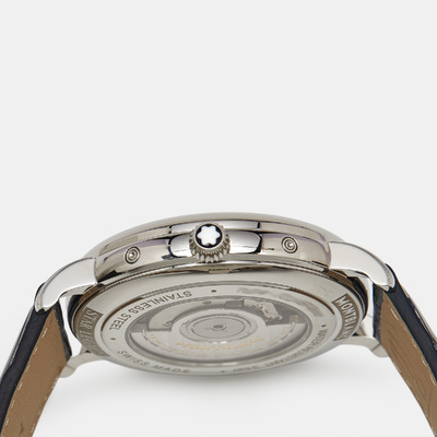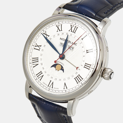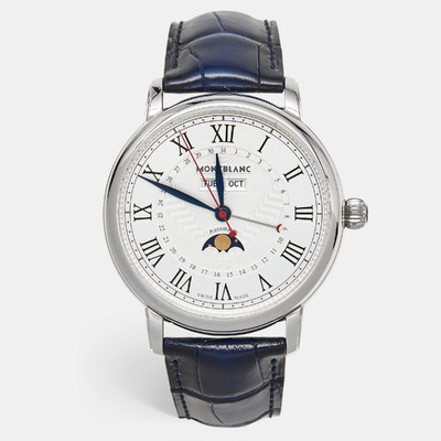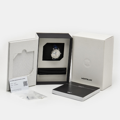The Montblanc Star Legacy Full Calendar M129178 balances precision and presence on the wrist. Its 42 mm stainless steel case frames a silver dial with full calendar functions, while blued hands and Roman numerals offer clarity with classic style. Paired with a rich alligator leather strap, the watch sits comfortably, marking time with authority and accompanying you for business meetings, formal evenings, or moments when detail matters.