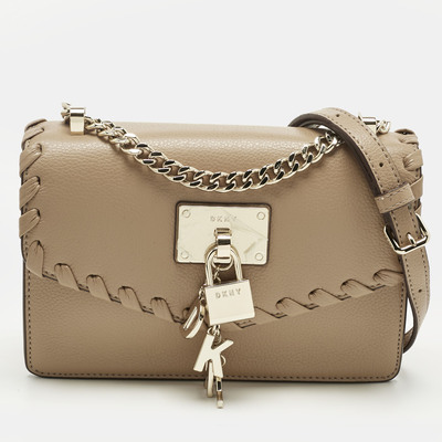 A versatile accessory for everyday wear, DKNY’s Elissa bag is crafted from beige pebbled leather and adorned with the signature padlock charm. The structured flap silhouette opens to a well organized interior, while the chain link strap allows for both crossbody and shoulder carry.