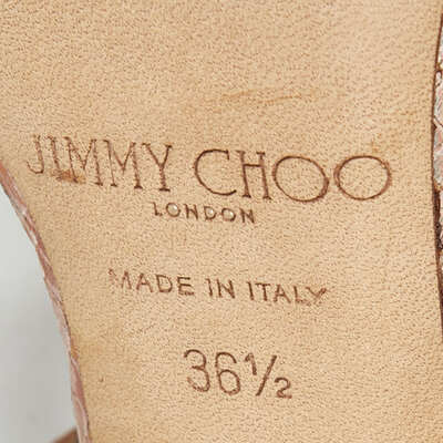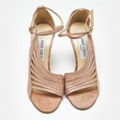These Jimmy Choo Florry sandals are crafted from snakeskin embossed pink leather, exuding feminine allure with a modern twist. The slim ankle strap and open toe design create a flattering profile, while the stiletto heel adds a touch of signature glamour.