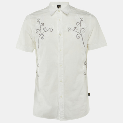 This Just Cavalli shirt combines classic tailoring with a hint of statement detail. Crafted in crisp white cotton, it features intricate embroidery along the placket, lending character to a sharp, slim fit silhouette suited for polished everyday wear.