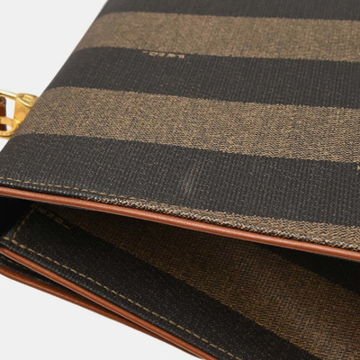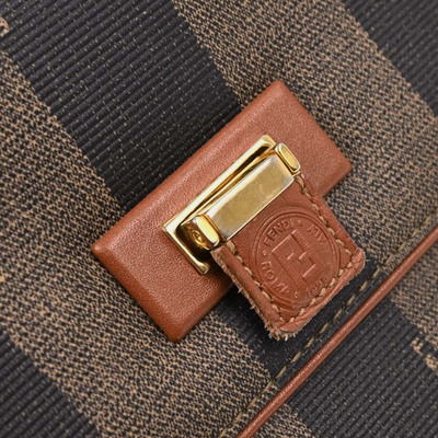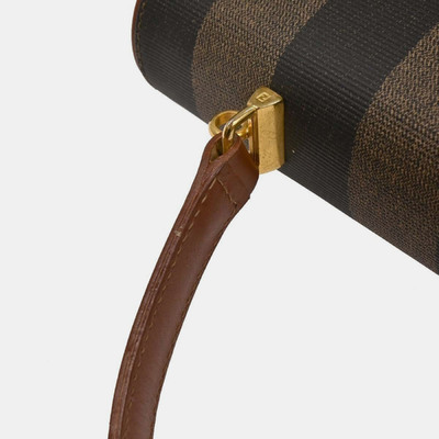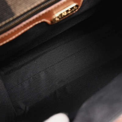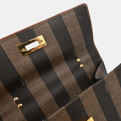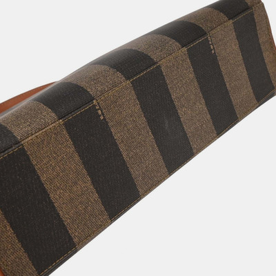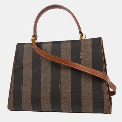 The Fendi Pequin 2 Way Handbag showcases the brand’s iconic striped design in black PVC with leather trim. It includes both top handles and a detachable shoulder strap, allowing for hand or crossbody wear.