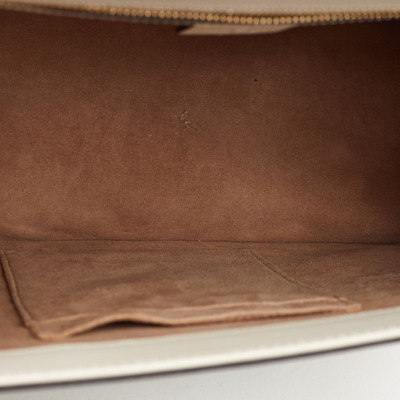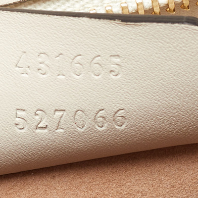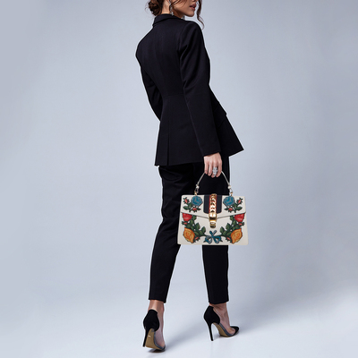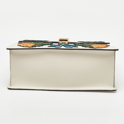 A collector’s favorite, Gucci’s Sylvie bag is crafted in white leather adorned with intricate floral embroidery. The signature web stripe and chain buckle closure reflect the house’s heritage, while the top handle and structured frame deliver an elegant, ladylike charm.