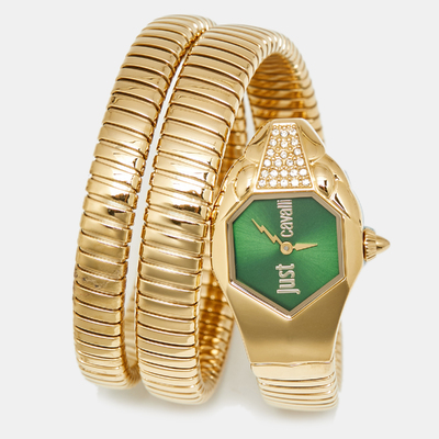 Just Cavalli’s Glam Chic wristwatch brings modern opulence to everyday timekeeping. The 22 mm case, rendered in yellow gold plated stainless steel, houses a striking green dial with signature logo detailing. A slender bracelet strap ensures a comfortable fit, while quartz movement guarantees precision, merging fashion forward design with reliable performance.