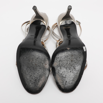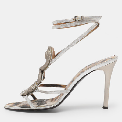 These Roberto Cavalli sandals feature silver leather with a striking heart and snake motif wrapped around the ankle strap. Bold and dramatic, they make a standout statement. Perfect for those who love edgy elegance.
