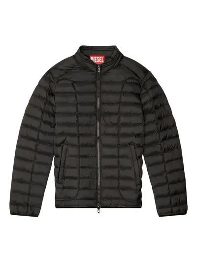 black front zip fastening quilted design mock neck long sleeves side welt pockets