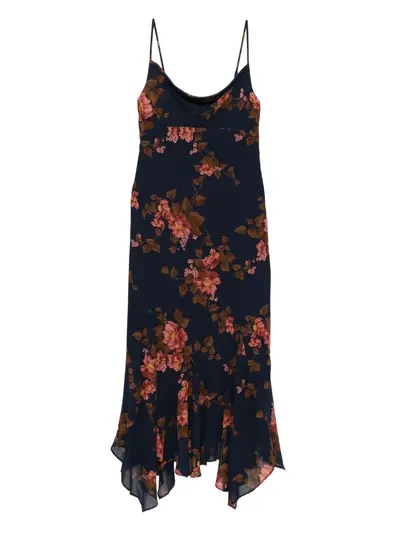 navy blue concealed side hook and zip fastening adjustable shoulder straps all-over floral print asymmetric hem