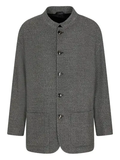 grey button fastening front pockets collarless long sleeves textured