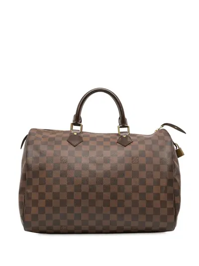 damier ebene canvas body with leather trim rolled leather top handles top zip closure interior slip pocket brown Serial Number: SP1100 Inclusions: padlock. Condition: GOOD. This previously owned and used item is in good condition with minimal signs of use. This may include fading of material or plating and scratches. Please refer to the photos on this product page for a detailed view of the item, including any damages declared.