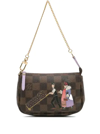 printed damier canvas body gold-tone curb chain link handle top zip closure brown Serial Number: DU2181 This item has no inclusions. Condition: EXCELLENT. This previously owned item is in near-perfect condition with no signs of damage or use. Please refer to the photos on this product page for a detailed view of the item, including any damages declared.