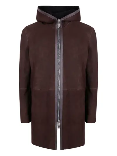 dark brown hooded front zip fastening panelled design