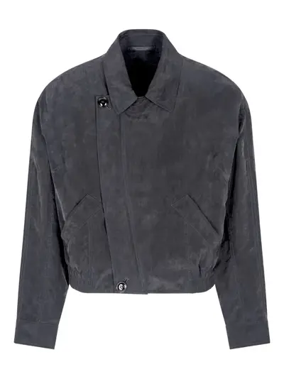 dark grey button fastening front flap pockets long sleeves elasticated hem