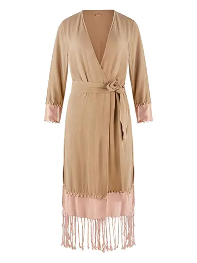 beige fringed hem belt v-neck long sleeves wrap design