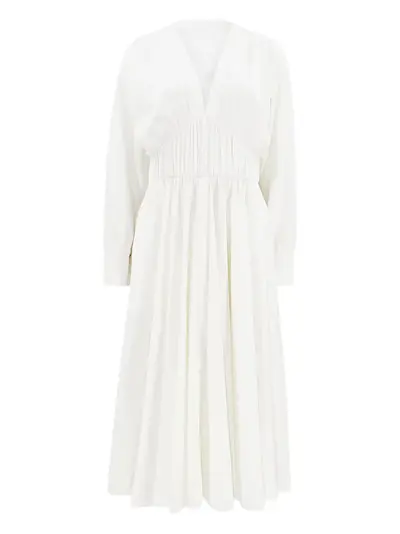 white v-neck long sleeves buttoned cuffs gathered detail a-line skirt