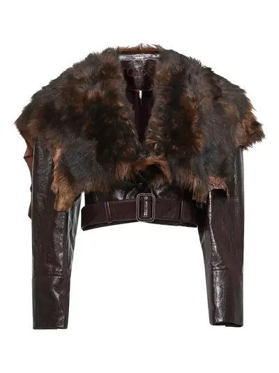 brown detachable shearling collar button cuffs adjustable detachable belt leather-covered horn buttons